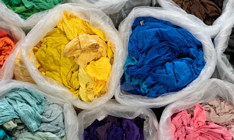 Secondhand shirts being sorted by color. The next step for them will be a trip to a commercial laundry and then back for sizing. At AWE we never manufacture new garments, and we never will.